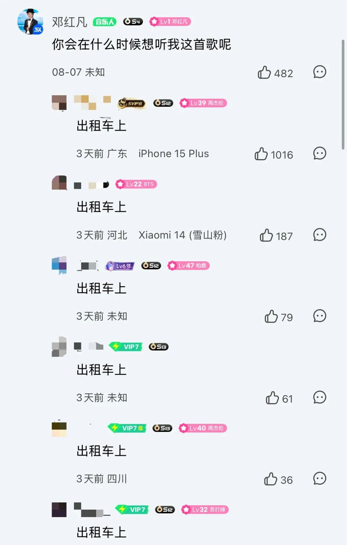 最近,在相关视频火了后,不少网友在邓师傅“你会在什么时候想听我这首歌呢”的评论区留言:“出租车上”。