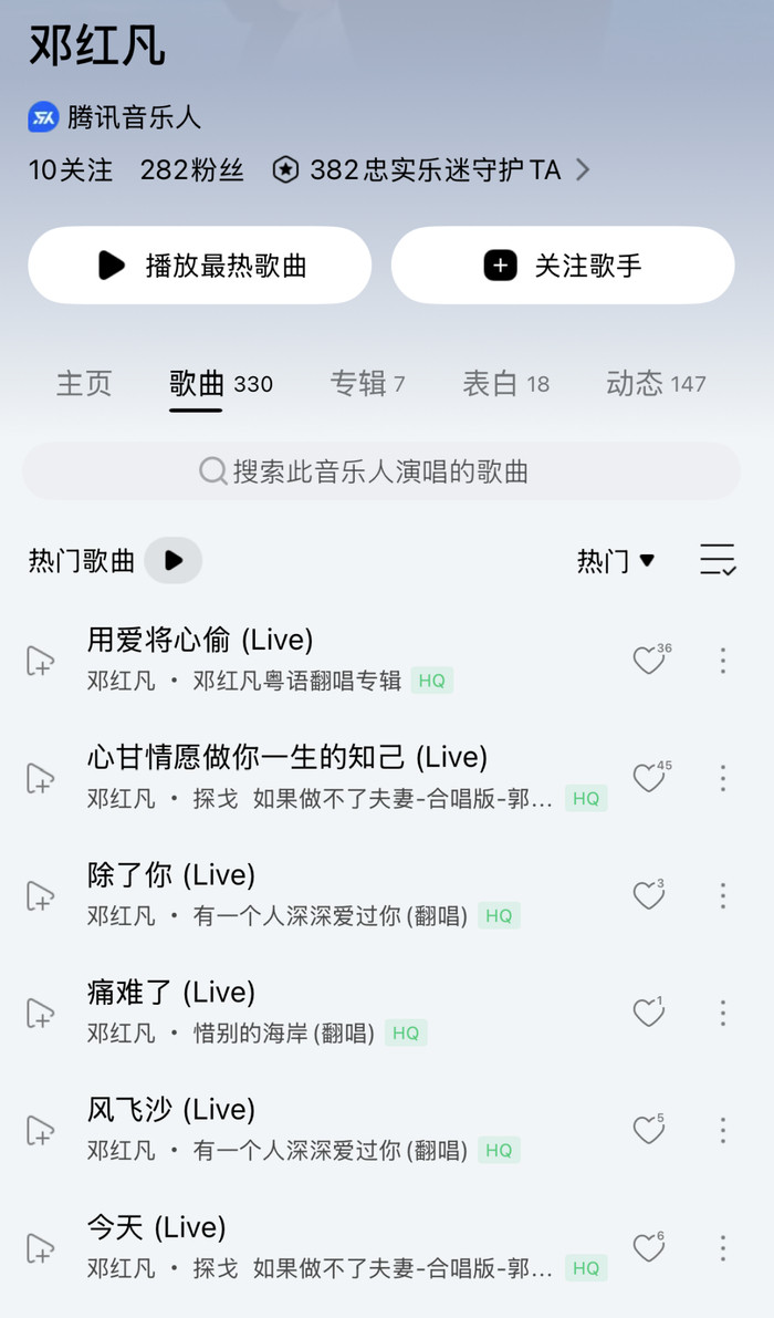 记者注意到,在某听歌软件上,邓师傅上传了330首自己的翻唱作品。