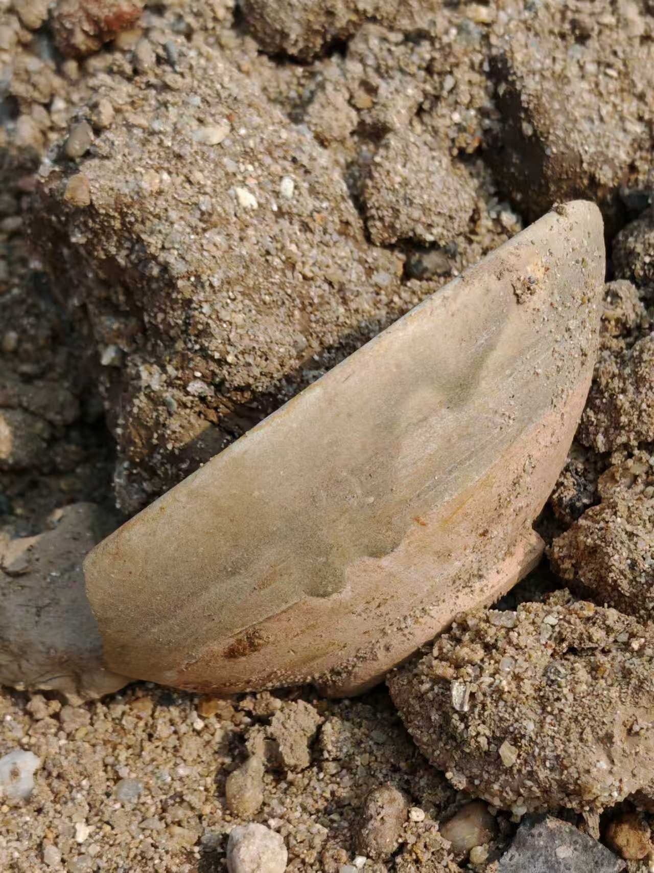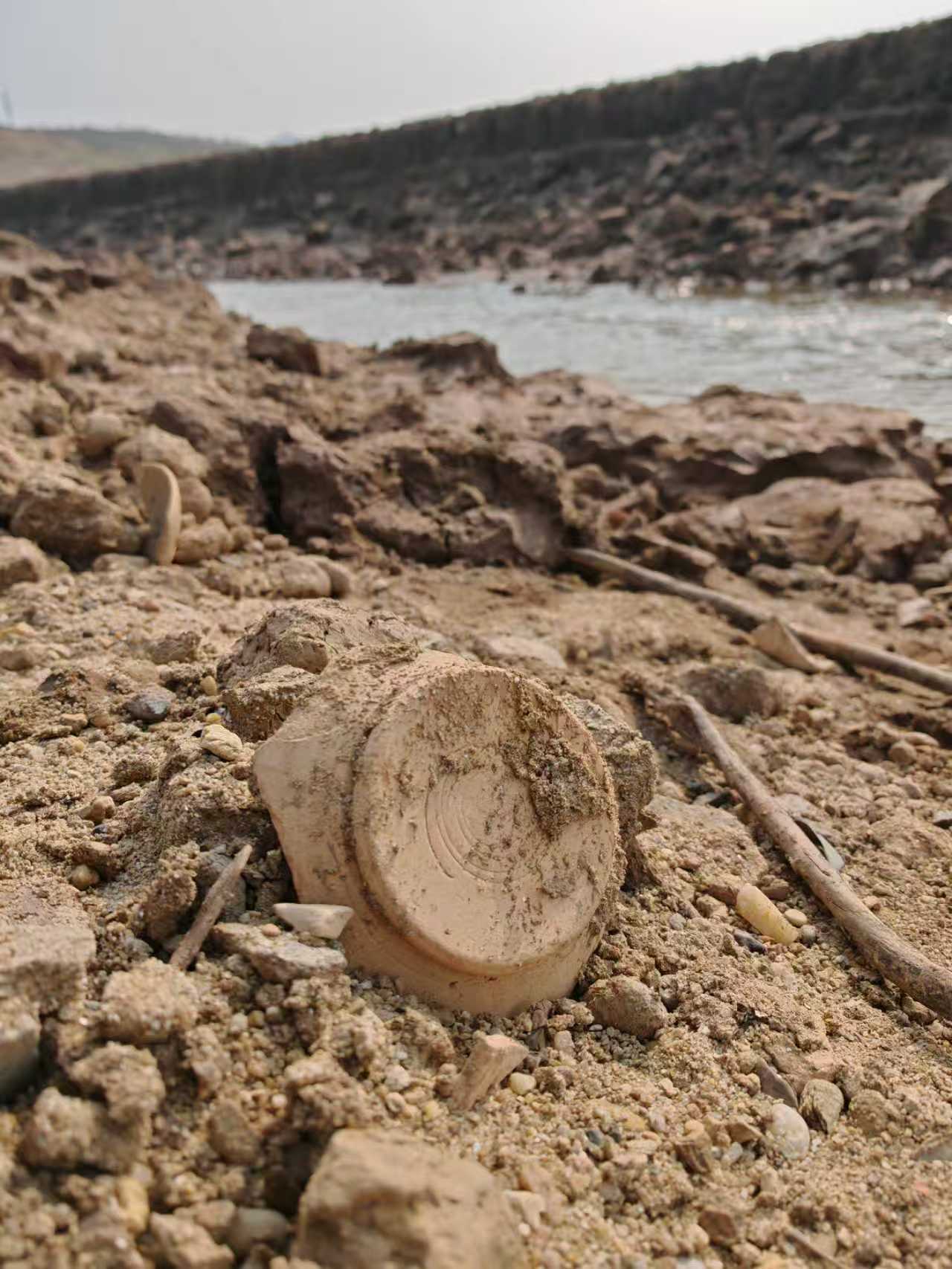 12月18日,记者来到网友提到的区域,江滩边有一定面积的裸漏土地,土质松软,疑似不久前为水域。在一处水道交叉口,有一定数量器物碎片散落在土壤中,水道数米长的距离内,便发现十多处。
